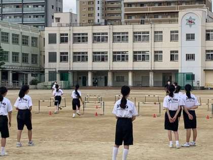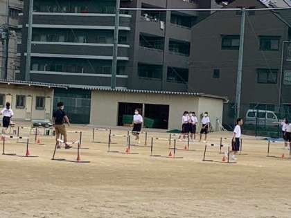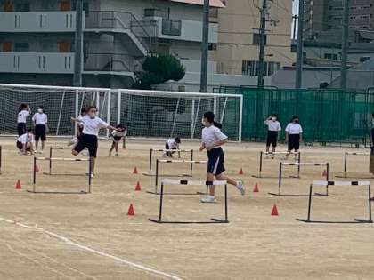 第1ハードルまでのアプローチの歩数の確認からハードリング動作の練習へとステップアップしています。