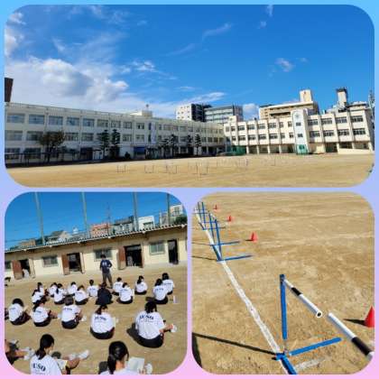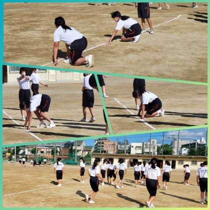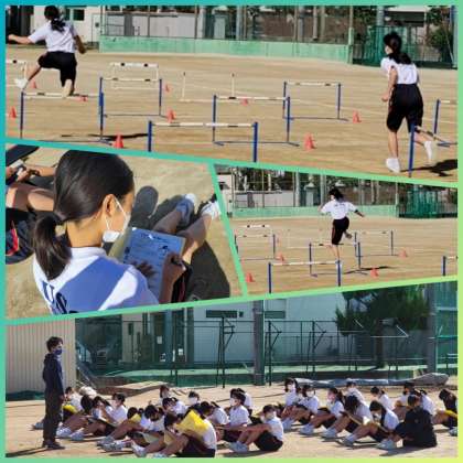 一年生女子は、陸上競技ハードル走に挑戦しています。リズミカルにそして速く50m先のゴールをめざします。