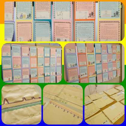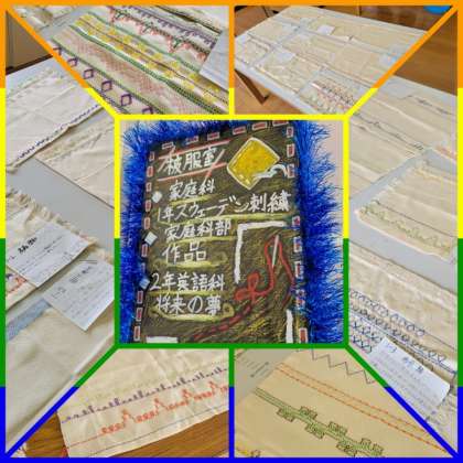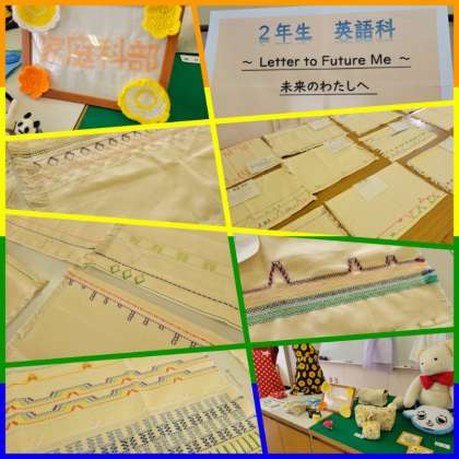 被服室では、美術部を始め、家庭科授業で作成されたスウェーデン刺しゅう、英語科授業で作成された『letter future to me』が展示されていました。