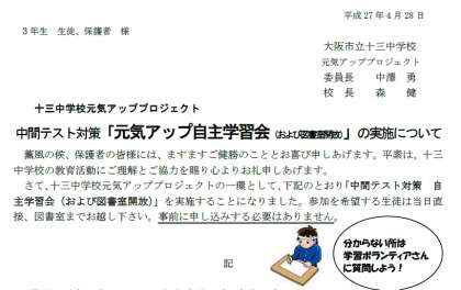 中間テスト対策「元気アップ自主学習会」