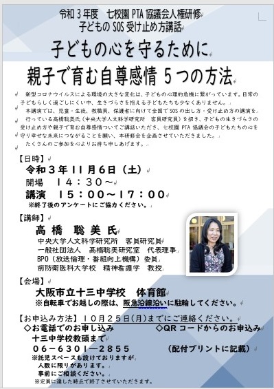 七校園PTA協議会では、『子どものSOS受け止め方講話』と題して、十三中学校校区の幼稚園と5小学校の保護者の方々を対象にした人権教育研修を開催します。
