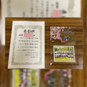 サッカー部女子が大阪市女子サッカー大会において優勝し、三人の生徒が表彰されました。
