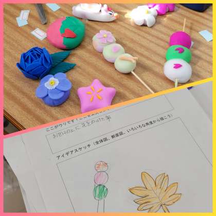 美味しいそうな和菓子と思いきや、全て粘土で作成したものです。季節感があり、上手にできていました。