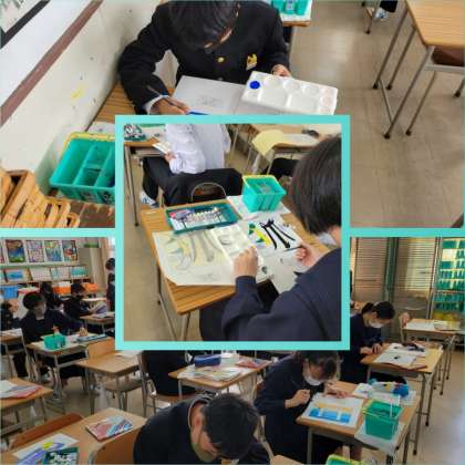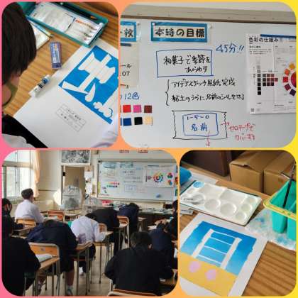 一年生美術授業では、『和菓子で季節をあらわす』と『レタリング絵文字』に取り組んでいました。