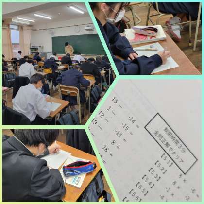 二年生数学では、生徒が希望するレベルの基本プリントを最初五分で行います。