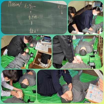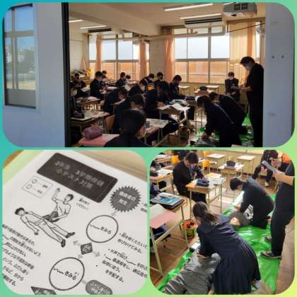 気道を確保し、胸骨圧迫を30回行います。二人を救いたい一心で夢中に胸骨を圧迫する姿は、頼もしい限りです。日常生活での有事等では地域の最も頼れるのが中学生です。この場にいる生徒たちは必ずその期待に応えられるようになると思いました。将来、地域を担う人材として、このような力、知識を付けた中学生は本当に大切ですね。今後の彼らの活躍が楽しみです。