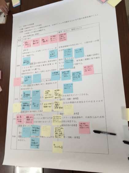 先生方が集まって、拡大した指導案を使い