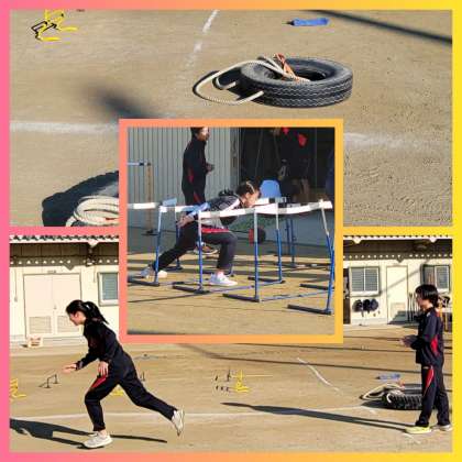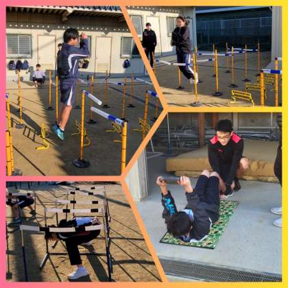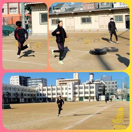 快晴のもと、運動場では陸上部が基礎練習を繰り返しています。ハードルを使って股関節の柔軟性を高め、鉄アレイを使い体幹を鍛えます。また、下半身強化のために高いハードルをバネのようにして垂直ジャンプで越えて行きます。