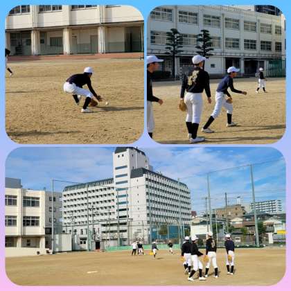 監督のノック打球を繰り返し捕球し一塁へと送球します。決して難しい打球ではありませんが、打球の正面に入り腰を落とし素早く送球へともっていきます。この一連の運動がスムーズに行われなければなりません。基本の徹底こそ名手への近道。