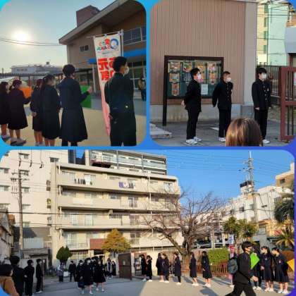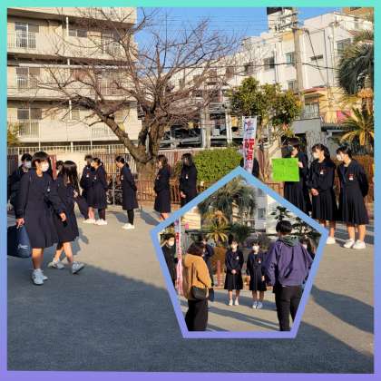 快晴の空のもと、「おはようございます」の声で生徒たちを迎え入れます。