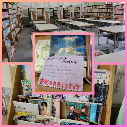 水曜日は、図書館補助員がいらっしゃいます。今話題の本や興味ある本の紹介など、アドバイスをもらえます。しかし、昼の図書室に生徒の姿はありません!