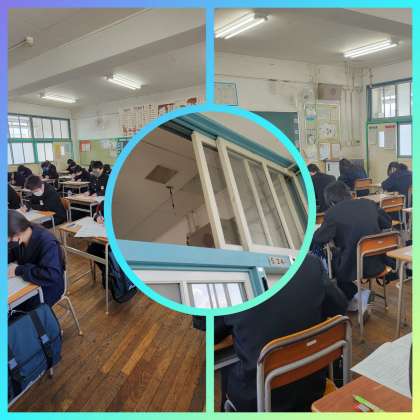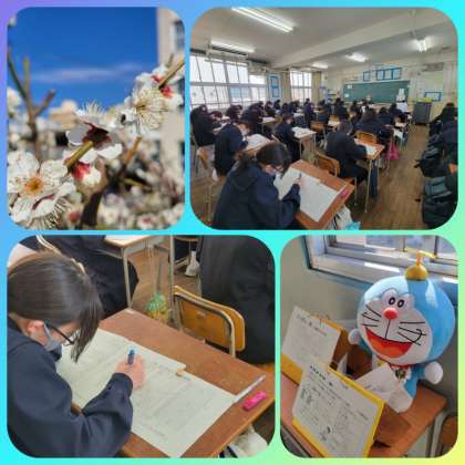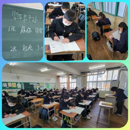 一年生教室では社会科のテストに臨んでいます。一年間総まとめのテストにみんな集中していました。