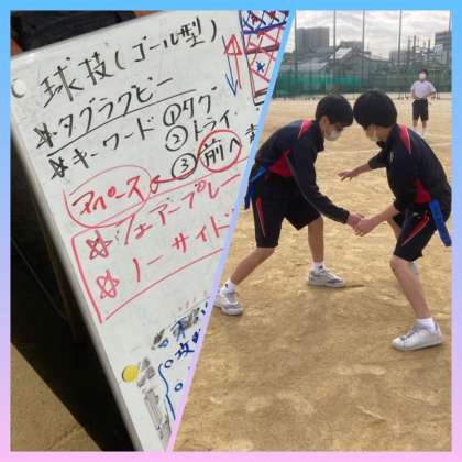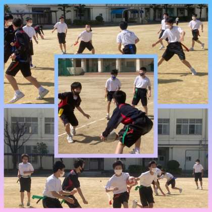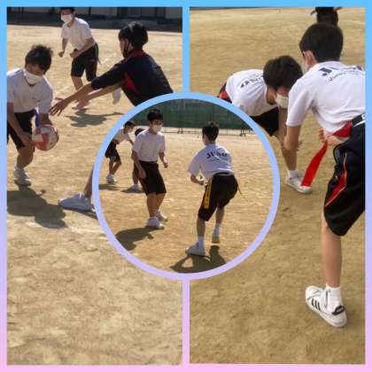 一年生最後の種目、ゴール型 タグラグビーです。キーワードは、タグとトライ。チームワークを大切に仲間と協力して前に進み、トライを目ざします。数回でかなり成長し、ゲーム感が出てきました。やりますね一年生!