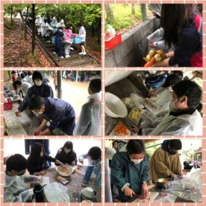 班で協力して、食材を切ったり、かまどを組み上げたり。