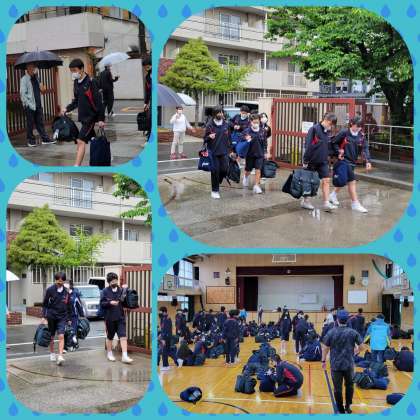 15時30分、一年生が学校へ到着しました。15時頃の激しい雨も、小雨になりました。バスから小走りで体育館に集まります。