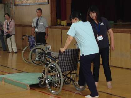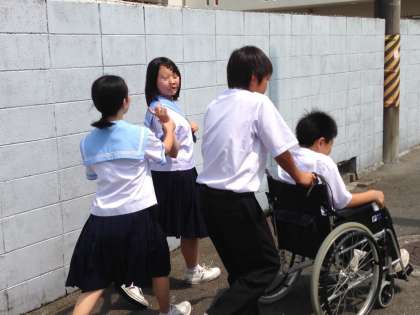 福祉団体の方から車いすの扱い方の説明を受け、実際に校内のエレベーターに乗ってみたり、校外を一周してみたり。「思ったよりこわい」「もっとゆっくり!」と、いろいろな声が飛びかっていました。