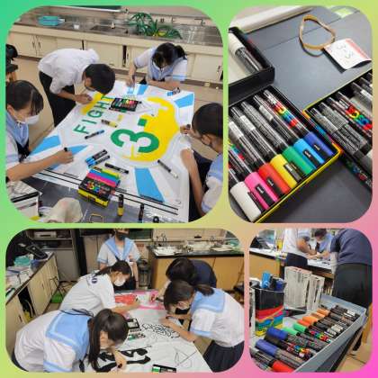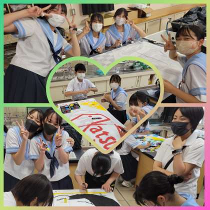 体育大会が6月10日(金)に開催されます。三年生は放課後、理科室に集まり各学級応援旗づくりに励んでいました。