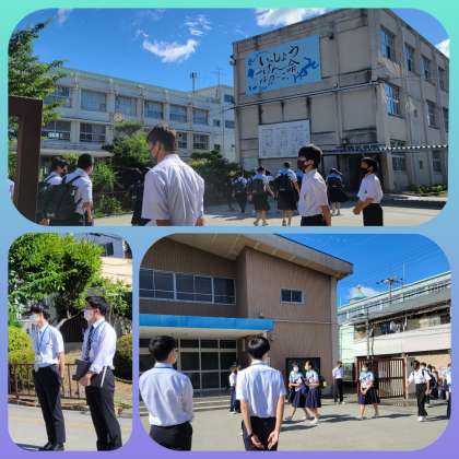 登校する生徒たちに、あいさつをする教育実習生。彼らも教室の授業だけでなく、学校行事にも、教員目線で参加でき、学ぶことができる良い機会になりますね。