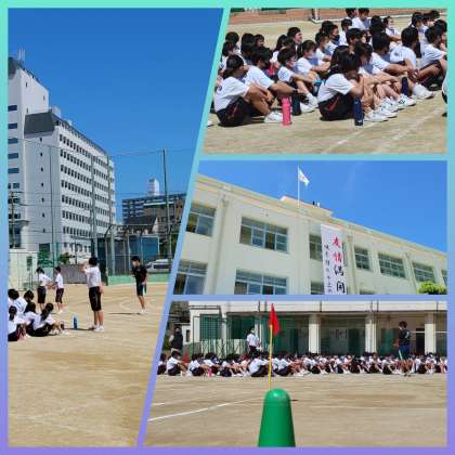 体育大会前日、運動場で練習に励む一年生。常に身近に水筒をおき、水分補給を行います。