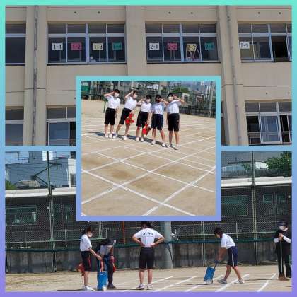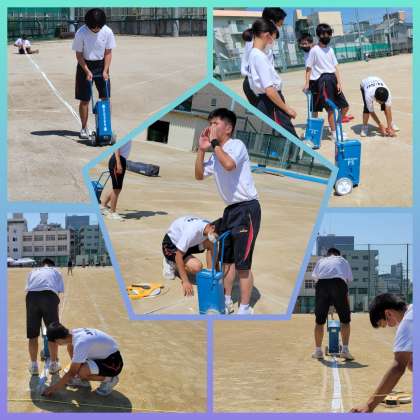 召集場所にたくさんのラインを引き終え、やり終えた達成感で、みんなにっこり。