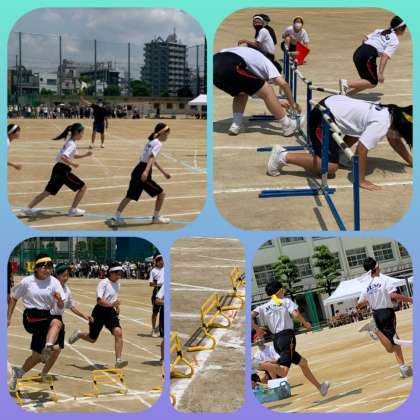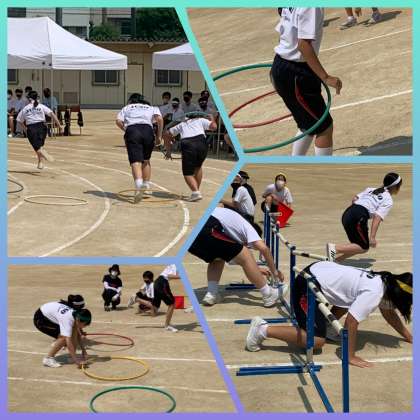 ミニハードルを飛び越え、低いハードルをくくります。最後はフラフープを通り抜けたら、めざすはゴールです。