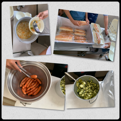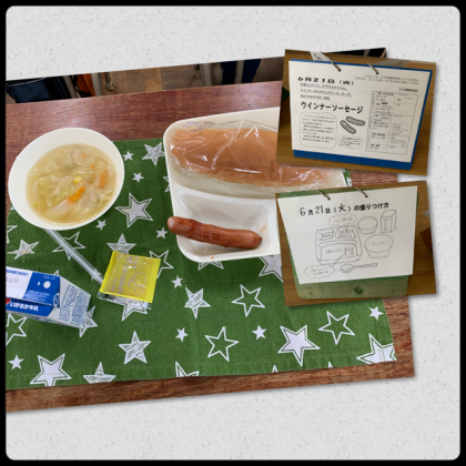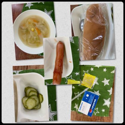 ?大型コッペパン、ウィンナーのケチャップソース、アプリコットジャム、きゅうりのサラダ、スープ、牛乳