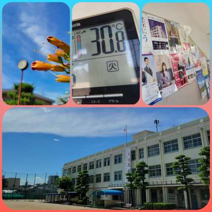 朝既に廊下の温度計が30度を示していました。暑い盛りに、ひときわ目を引く濃いオレンジ色の花、ノウゼンカズラが見事に花を咲かせています。