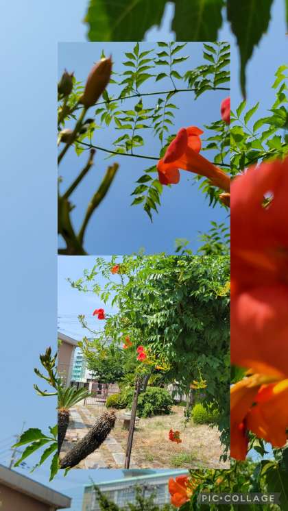 夏空に色鮮やかな花を咲かせるノウゼンカズラ。