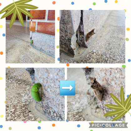− 玄関、コンクリート壁に小さな緑の幼虫を教員が発見!(よく気づいたものです)