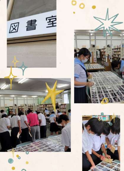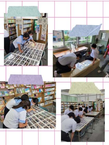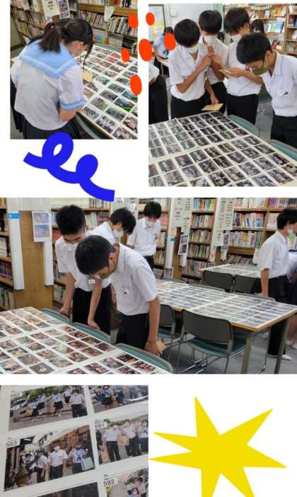 三年生修学旅行のスナップ写真が図書室に展示されています。学級単位で見学し、希望の写真を選びます。