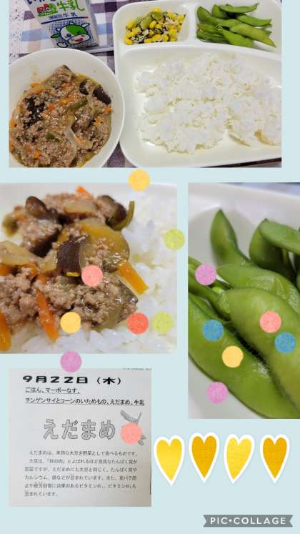 今週最後の給食は『マーボーなす』『枝豆』です。