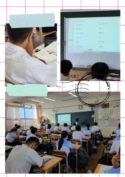 三年生英語、学力向上研究授業を行いました。新出単語を発音と意味を声に出しながら反復します。日々の単語習得トレーニングとして声に出すことは不可欠です。