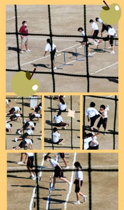 運動場では、一年生の体育授業、ハードル走を行っています。
