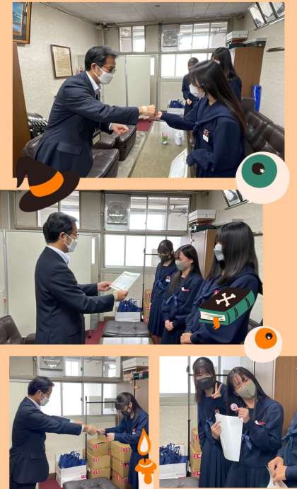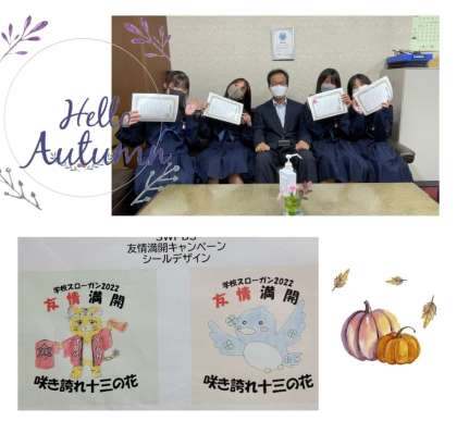 昼休み三年生女子が校長室を訪問。学校長から賞状が授与され、キーホルダーがプレゼントされました。