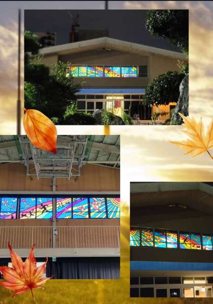 通用門へ向かうアプローチ、正面体育館玄関上の窓には、先日文化発表会で作成された二年生のステンドグラスが鮮やかな光を放っています。