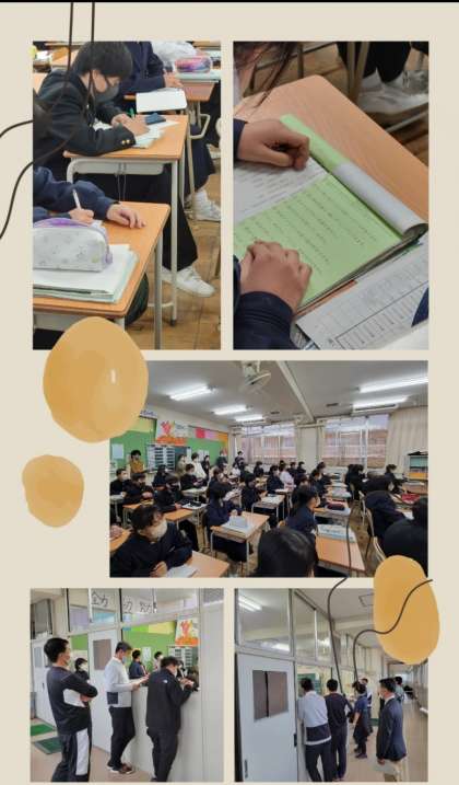 本日は、他学年等の生徒は5時間で授業を終え下校していますので、全教員が1年2組に集まり研究授業を参観しています。