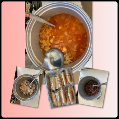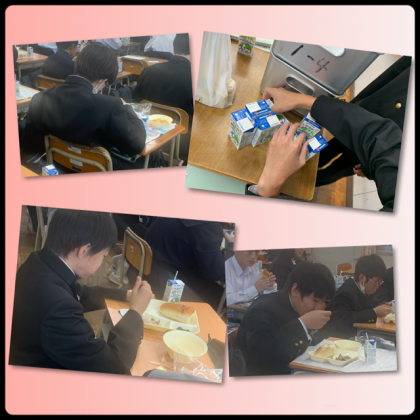 ?大型コッペパン、バター、豚肉のガーリック焼き、ケチャップ煮、うずら豆のグラッセ、牛乳