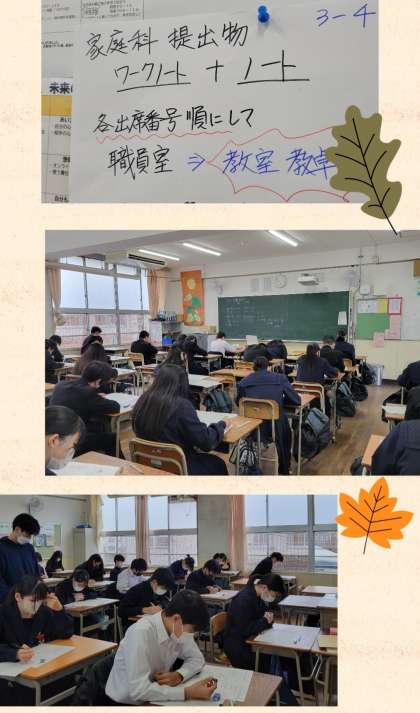 三年生教室では、家庭科の提出物が示されありました。他の教科もノートやワークなど評価に関係するものも多数あると思います。期限を守り不備のないように提出しましょう。