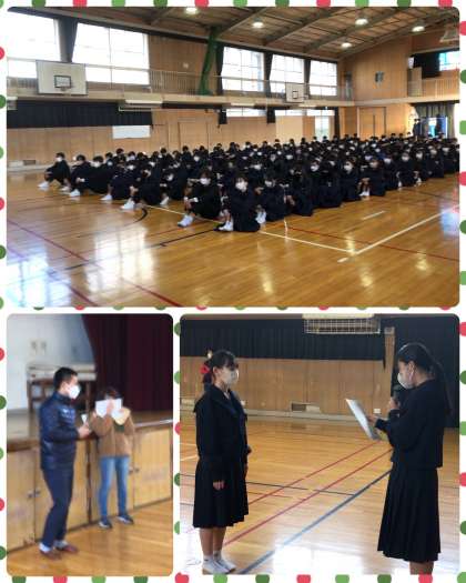 そのあとは、3学期に行われる合唱コンクールの自由曲の抽選会。各クラスが第1希望の曲を発表し、2組と3組の希望が重複したため、正々堂々抽選を行いました。白熱の抽選の結果、3組が希望曲を勝ち取りました。3学期の大きな行事である合唱コンクール、今からどんな合唱ができあがるか、とても楽しみです!