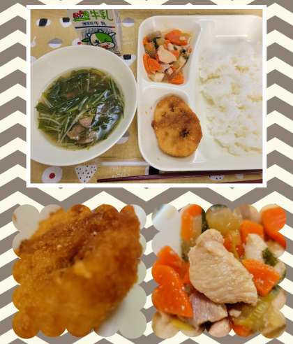 『はりはり汁』に、『れんこんのフライ大阪ソース味』『鶏肉の土手焼き風です。