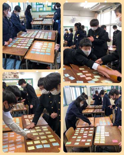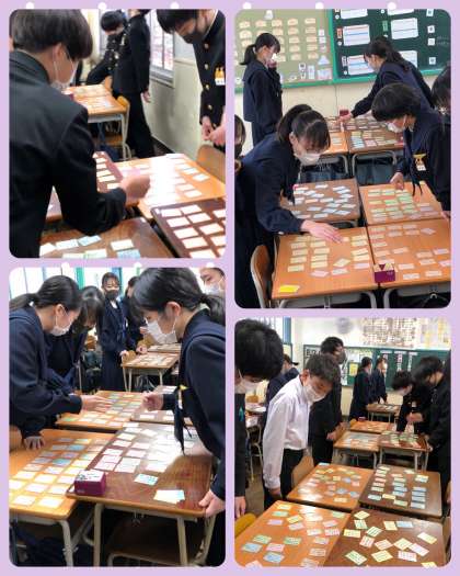 2年生は、来週の水曜日にせまった百人一首大会に向けて、クラスごとに総合や国語の授業の時間内で練習に取り組んでいます。練習を重ねるごとに、上の句でとる人がどんどん増え、レベルの高い戦いがあちこちで見られます。