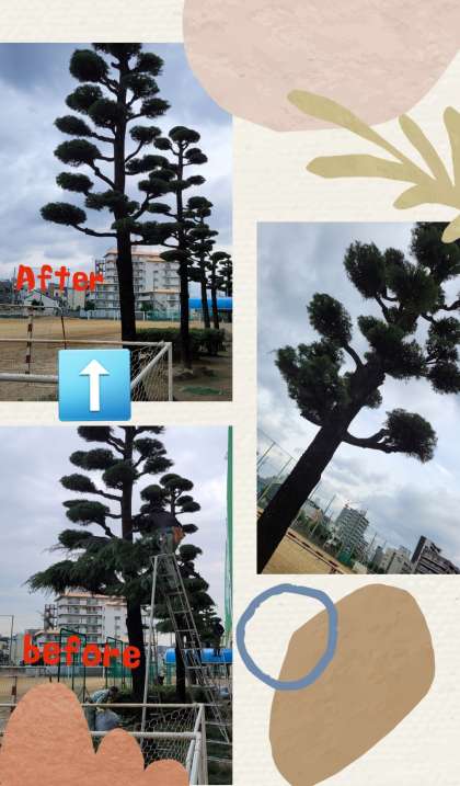 梯子の安定を確認し、安全ベルトを枝にかけて作業を行います。手際よく剪定され、職員室前の視界が広がりました。