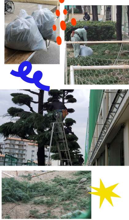 二日間に渡り低木から高木まで、生い茂った常緑樹の剪定を行っていただきました。作業をするのは複数校から集まった管理作業員さんたちです。