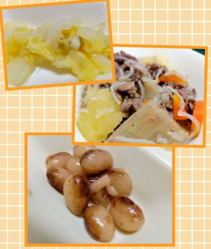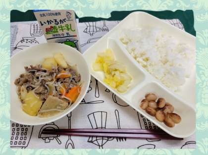 牛肉とじゃがいもをメインにして、糸こんにゃく、玉ねぎ、にんじんが入っています。糸こんにゃくは低カロリーで、食物繊維が豊富。お腹の中をきれいにしてくれます。