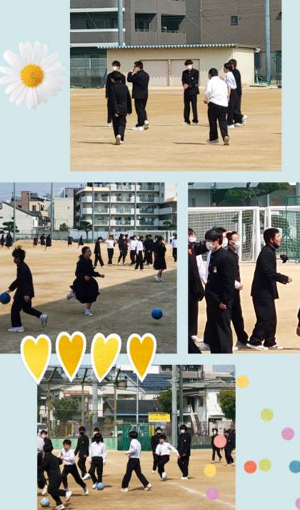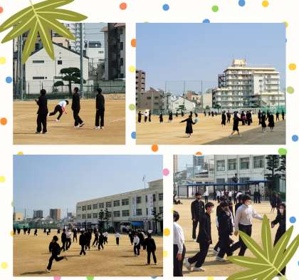 昼休み、たくさんの生徒たちが運動場で遊んでいます。