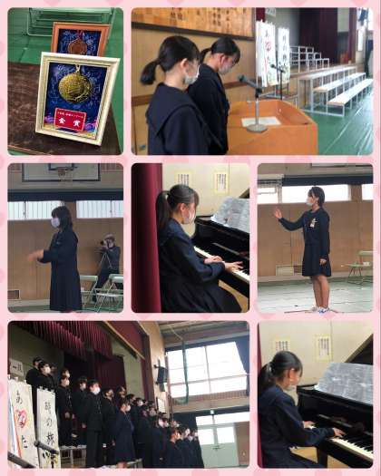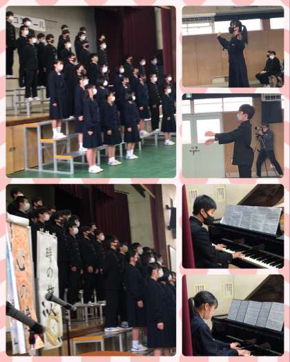 2学期の末から、長い時間をかけて、音楽の授業や総合の時間で準備をしてきました。本番当日、さすがに生徒たちは緊張の色が隠せませんが、多くの保護者の方に見守られて、コンクールがスタートしました。