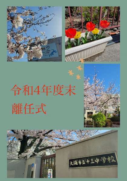 着任から10年の先生から1年で本校を離れる先生、それぞれ自身の十三中を振り返り、教職員へお礼のメッセージがありました。
