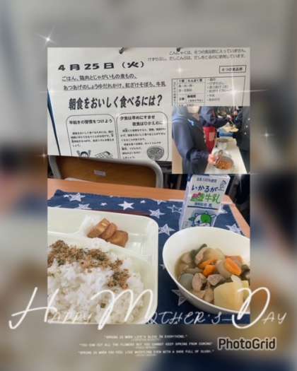 ごはん、鶏肉とじゃがいもの煮もの、厚あげのしょうゆだれかけ、紅ざけそぼろ、