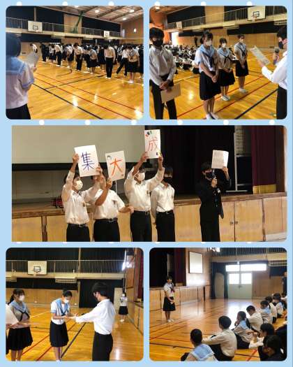 続いて、修学旅行関連の連絡。委員長会からは、修学旅行スローガンの発表が、レク係代表からは、レク大会のタイトル決定のお知らせがありました。
