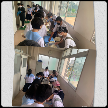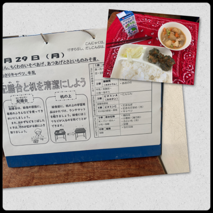 ごはん、ちくわのいそべあげ、あつあげとさといものみそ煮、あっさりキャベツ、牛乳